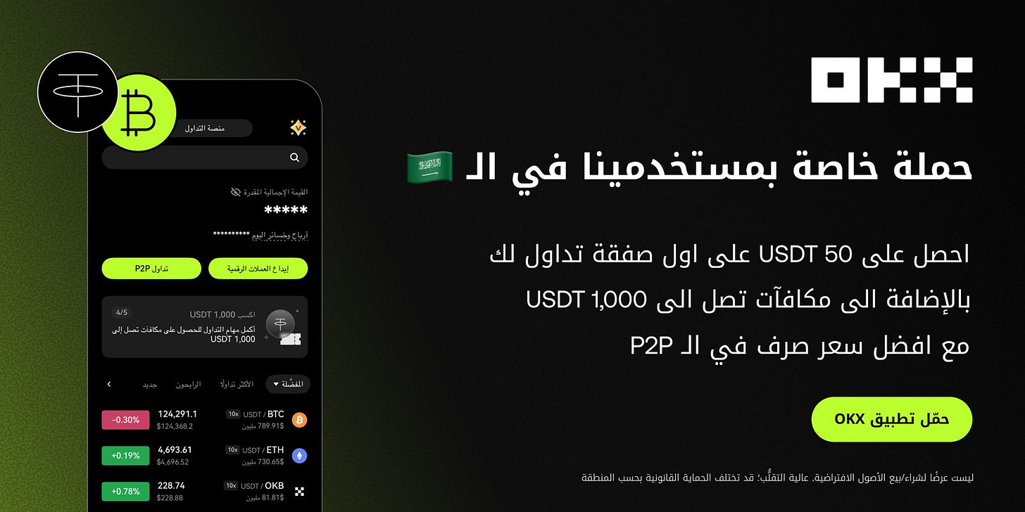 هذه الحملة مخصصة حصريًا لمستخدمي OKX في المملكة العربية السعودية.احصل على 50 USDT مجانًا عند إتمام أول صفقة تداول لك، بالإضافة إلى مكافآت تصل إلى 1,000 USDT كلما زاد حجم تداولك على المنصة، مع الاستفادة من أفضل أسعار الصرف في خدمة P2P.